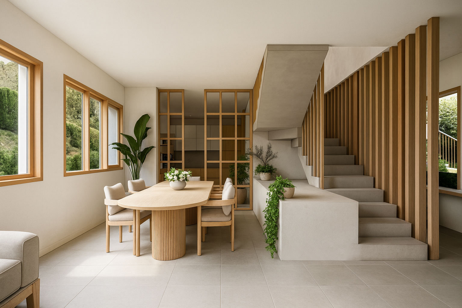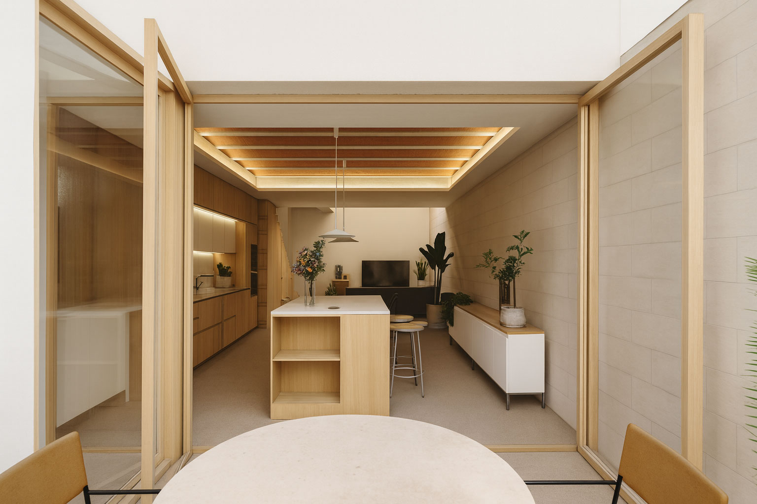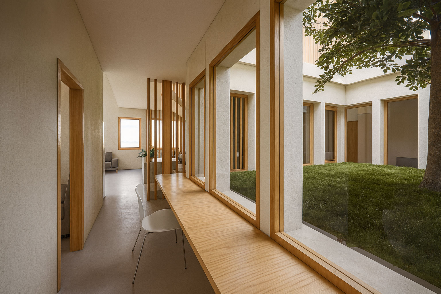Ese patio se convirtió en el corazón del proyecto. Gracias a él, incluso las estancias situadas detrás del muro de contención reciben luz natural, transformando lo que podría ser un espacio oscuro en lugares cálidos y habitables.