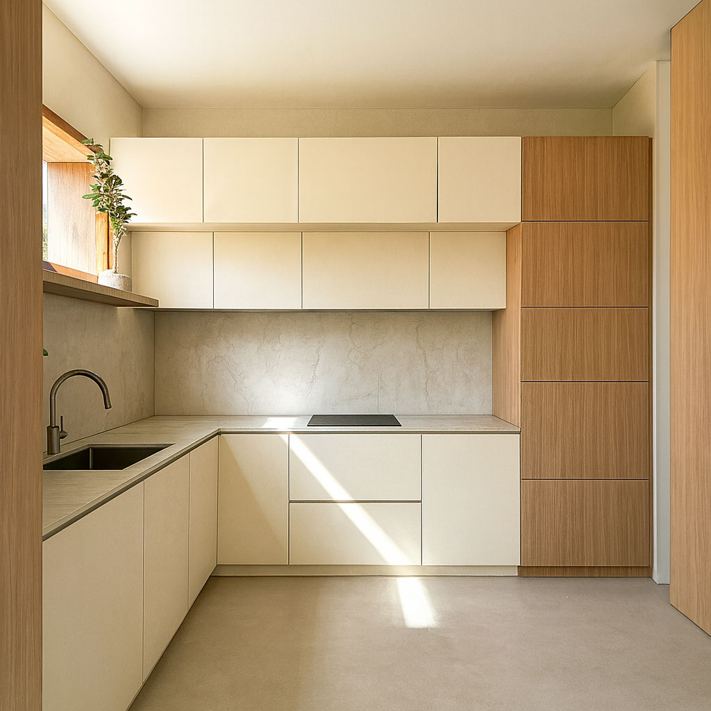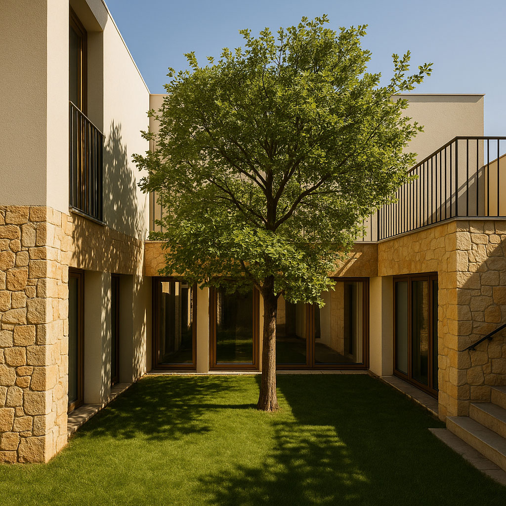 Pero había un reto. La normativa urbanística, sumada a la inclinación del terreno, dejaba un espacio de construcción reducido y casi cuadrado. En lugar de resignarnos a esa geometría rígida, buscamos otra solución: una forma que abriera la casa hacia un pequeño patio, un rincón íntimo capaz de llevar la luz a cada estancia.