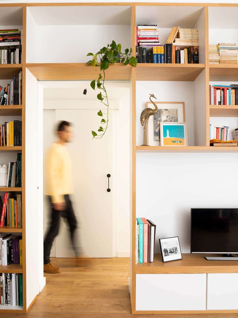 El muro divisorio se convirtió en el protagonista del diseño. A un lado, un mueble longitudinal que recorre casi toda la vivienda, pensado para maximizar el almacenamiento y aportar continuidad visual. En el lado opuesto, otro mueble actúa como un filtro sutil en la entrada, cerrando ligeramente el vestíbulo para otorgar mayor privacidad a la sala de estar.